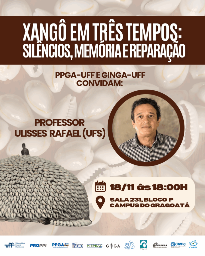 É com grande alegria que o PPGA-UFF e o Ginga-UFF, por meio do Convênio Capes/PRAPG-UFS, convidam o professor Ulisses Rafael para a palestra “Xangô em Três Tempos: Silêncio, Memória e Reparação”.O encontro discutirá a pesquisa do professor sobre o Quebra de Xangô, episódio de destruição dos terreiros e perseguição às religiões de matriz africana, promovido por uma milícia paramilitar em Maceió, no ano de 1912, e suas repercussões para os terreiros e para a sociedade no período pós-Quebra até os dias atuais.A palestra será aberta ao público, e você é nosso(a) convidado(a)!